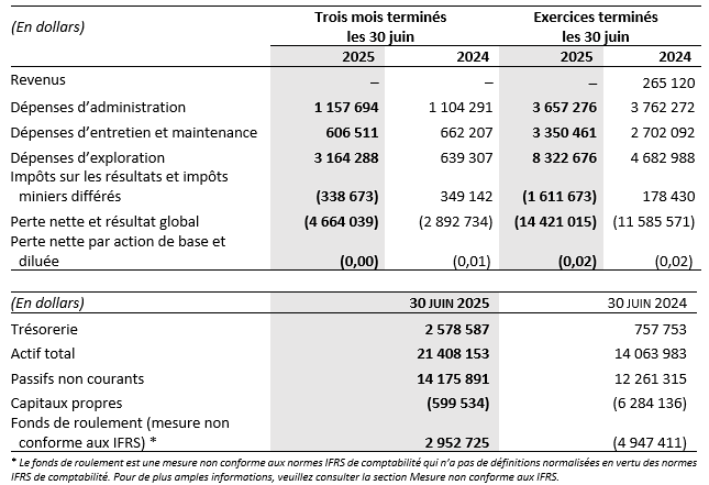 Pascal Hamelin, président et chef de la direction, déclare: « L’exercice 2025 a été un exercice important en termes de réalisations au niveau de l’exploration sur nos propriétés Géant Dormant et Flordin. Suite au financement réalisé avec Nebari le 3 juillet 2025, les prochains trimestres démonteront une image différente de la propriété Géant Dormant en passant en mode de développement. Les préparatifs de mise en production ayant commencé en août 2025, la Société continue progressivement le développement de la propriété ».