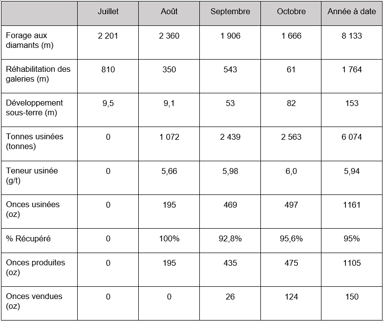 Au 31 octobre, 1 chantier en production et 2 chantiers étaient en développement sous-terre.  Au parc à résidus, les travaux de génie civil se sont poursuivis en préparation au rehaussement prévu à l’été 2026.  Le nombre de foreuses aux diamants est passé de 2 à 3 unités durant le mois d’octobre.  La variation des métrages de forage aux diamants mensuellement s’explique, entre autres, par le nombre de déplacement des foreuses durant le mois.  La diminution des métrages de réhabilitation de galerie en octobre est due au déplacement des équipes vers la réhabilitation des recettes du puits aux niveaux 235, 295, et 355.