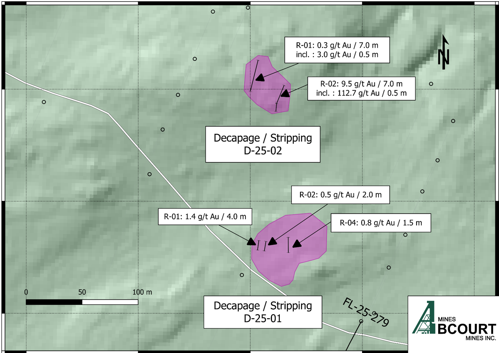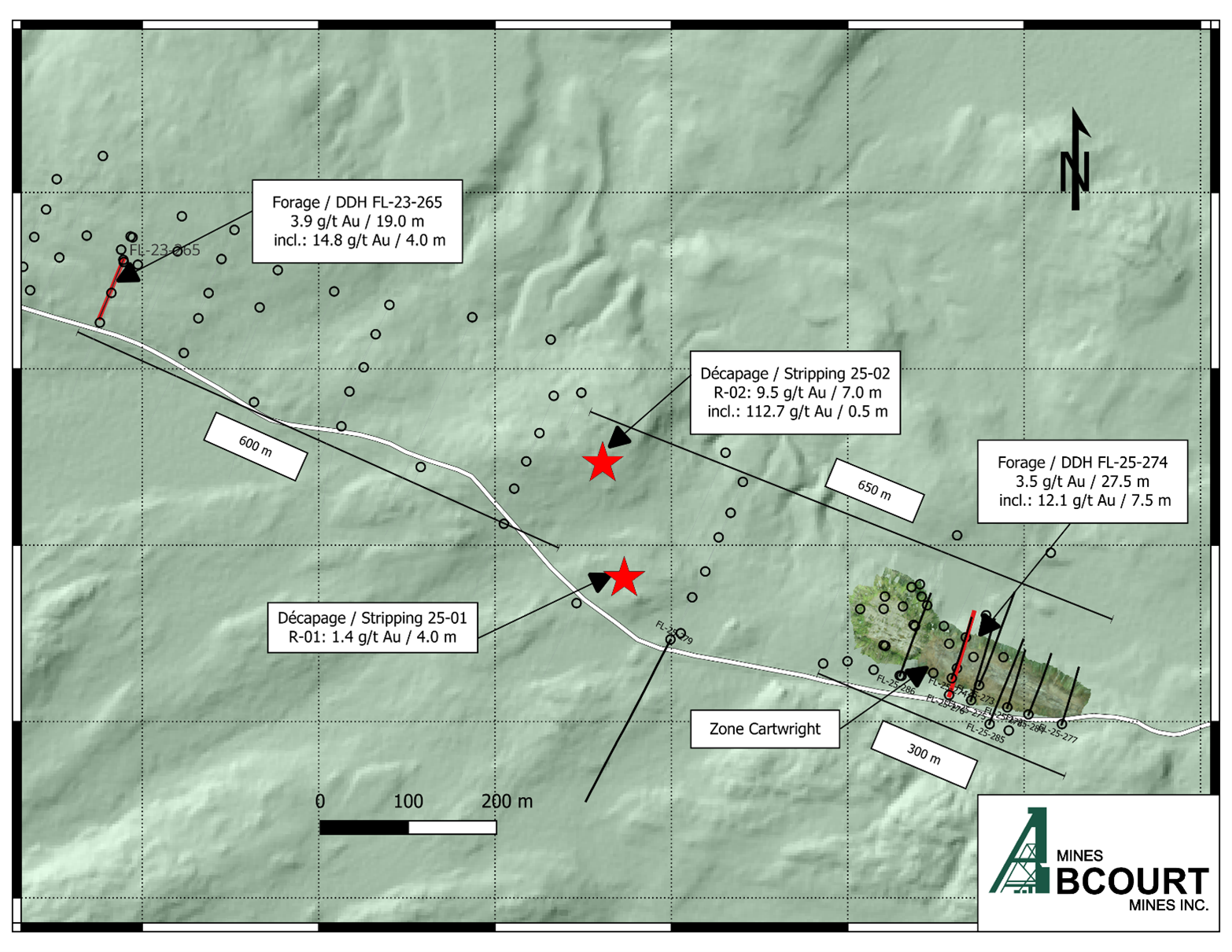 Rouyn-Noranda, Canada, le 25 septembre 2025 – Mines Abcourt Inc. (« Abcourt » ou la « Société ») (TSX Venture : ABI) (OTCQB : ABMBF) est heureuse d’annoncer ses plus récents résultats sur le projet Flordin Cartwright, où deux nouveaux décapages ont été réalisés. Ceux-ci ont permis d’étendre la zone minéralisée actuelle à plus de 650 mètres tout en identifiant de nouvelles zones minéralisées parallèles aux zones précédemment identifiées qui n’avaient jamais été exposées ou sondées en profondeur.