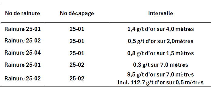 Pascal Hamelin, président et chef de la direction commente : « Les nouvelles rainures effectuées confirment la continuité des zones minéralisées connues sur plus de 650 mètres. Les zones restent ouvertes latéralement à l’est et à l’ouest. Une fois encore, avec un budget minimal, nous avons été en mesure d’accroître significativement l’empreinte de la minéralisation aurifère en surface. Ces nouveaux résultats vont nous permettre de bien orienter notre prochaine phase de forage. »